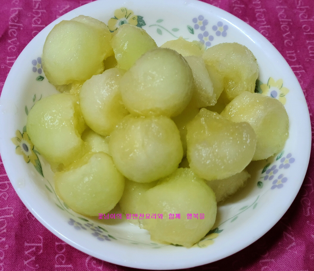메론은 반으로 잘라서 속에 메론씨앗을 제거한다.