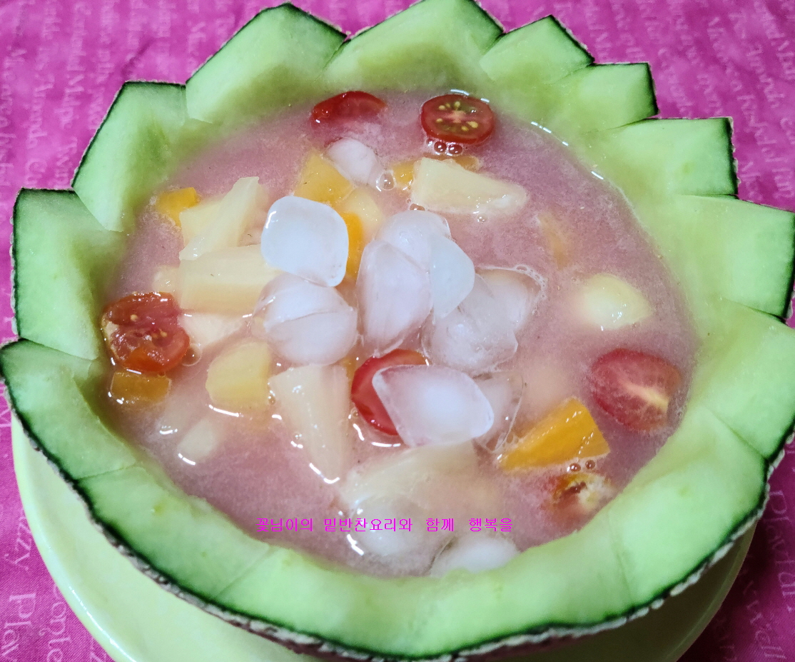 메론속에 메론,칵테일, 얼음 , 딸기물을 넣어준다.