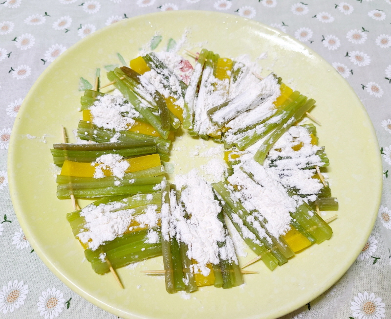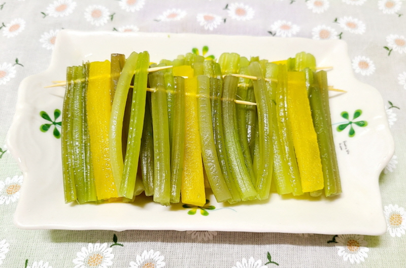 고구마줄기와 단무지를 이쑤시게에 끼어준다.