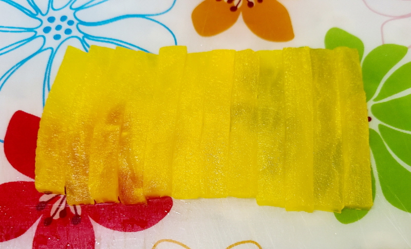 주재료 : 주재료 : 고구마줄기150g , 김밥용단무지 36g(2줄),계란1개, 부침가루10g ,