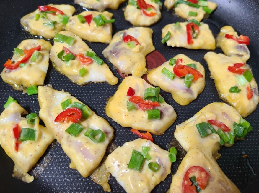 홍고추와 쪽파를 얹져서 부친다.