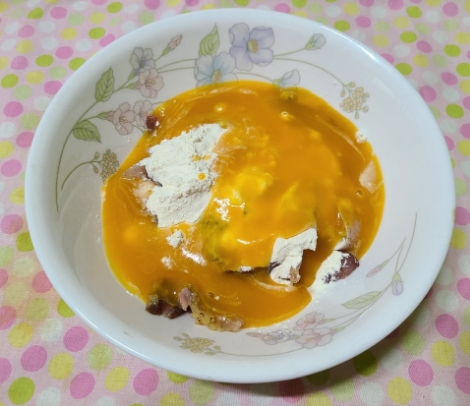 미리 갈아놓은 단호박을 넣고 반죽을 해준다.