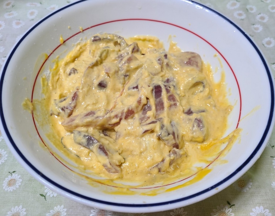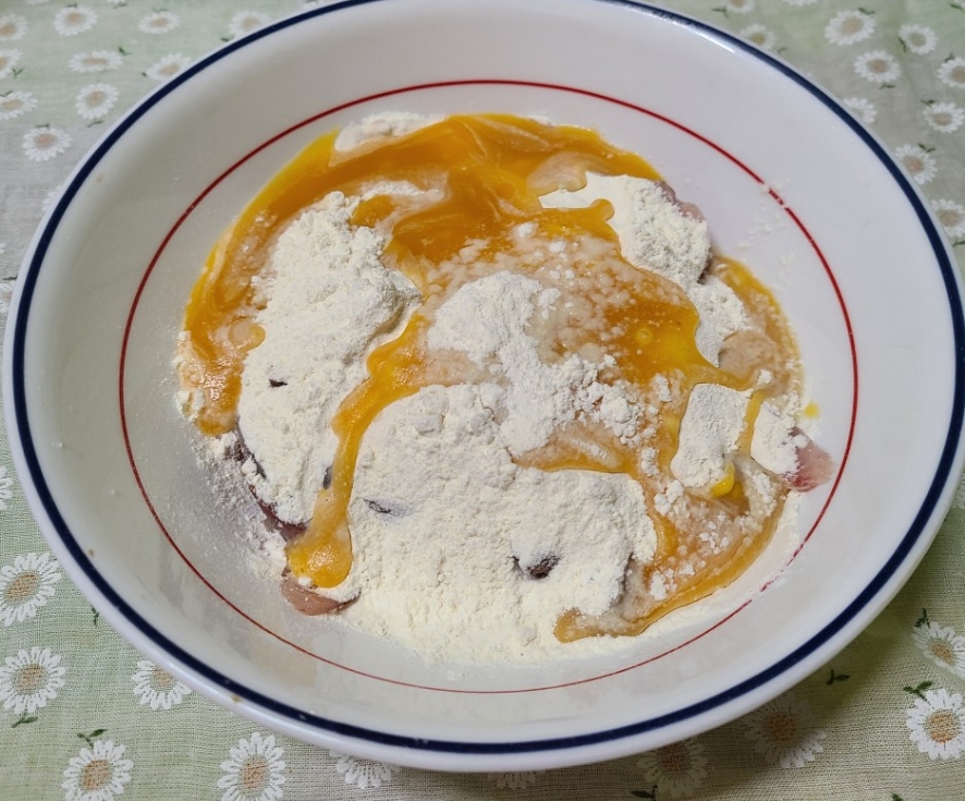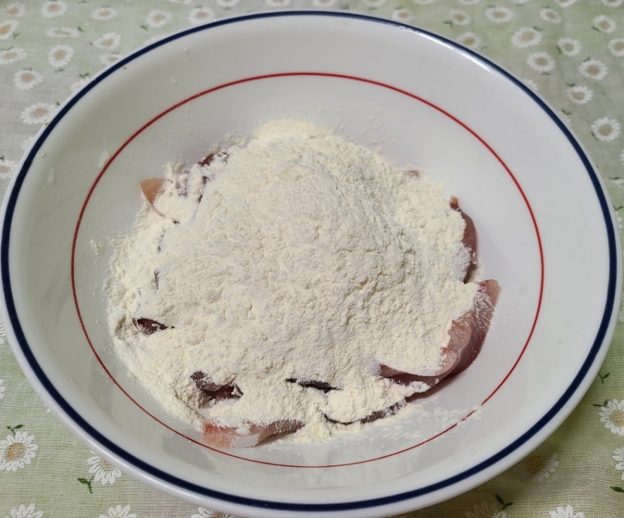 그릇에 방어를 담고 튀김가루와 밀가루를 넣어준다.