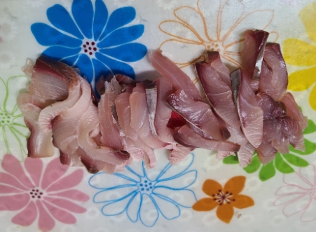 .횟감으로 보내온 방어를 살짝 저미어서 준비한다.