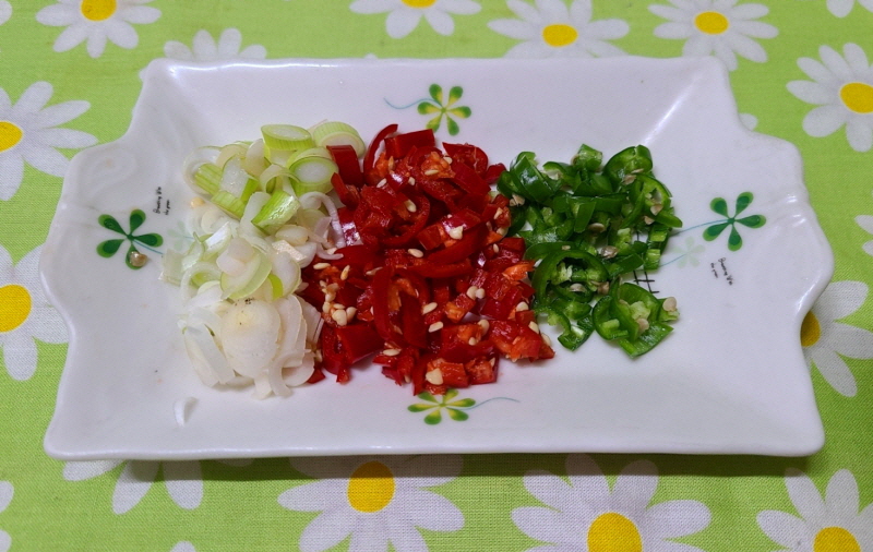 청양고추7g, 홍고추17g , 천일염약간,통깨약간, 다진마늘1쪽,