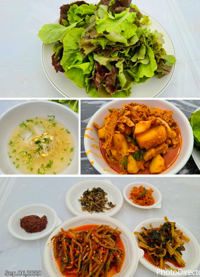고구마순김치, 쌈장, 콩나물냉국 등등
