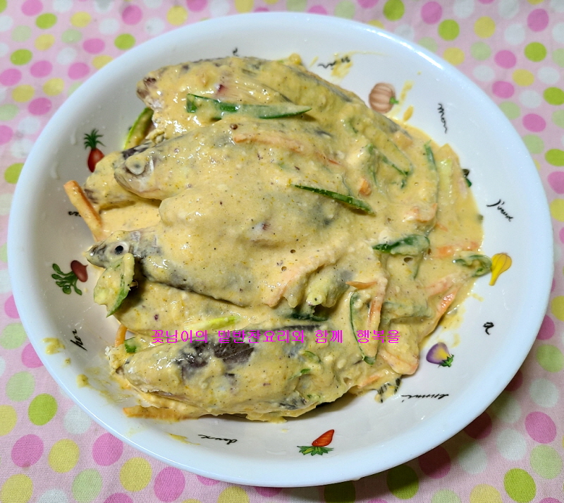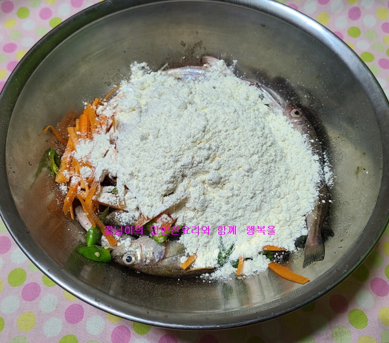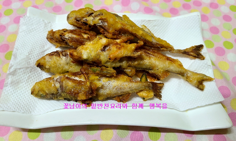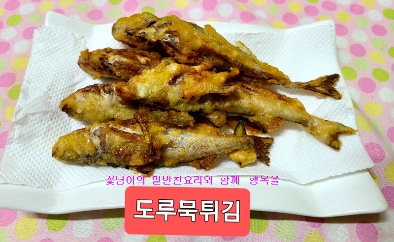 주재료 : 도루묵1,000 g, 튀감가루 120g , 밀가루 50g,청양고추 2개, 당근 40g ,적색양파 60g ,